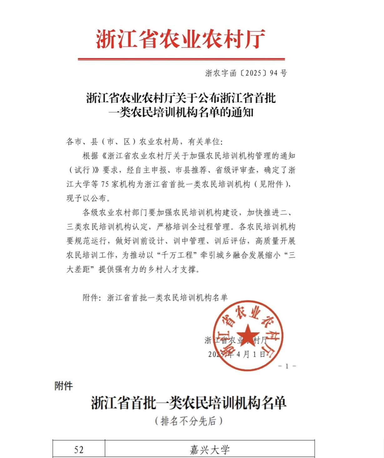 近日,浙江省农业农村厅印发《关于公布浙江省首批一类农民培训机构名单的通知》(浙农字函〔2025〕94号),确定75家机构为浙江省首批一类农民培训机构,我校成功入选。
